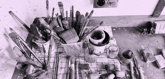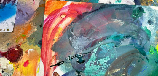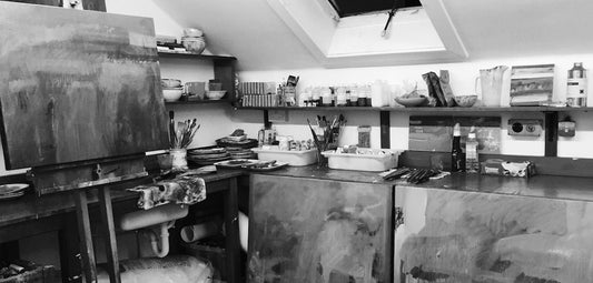 Abstract paintings and artist's studio inspired prints on 100% fine wool and silk scarves.